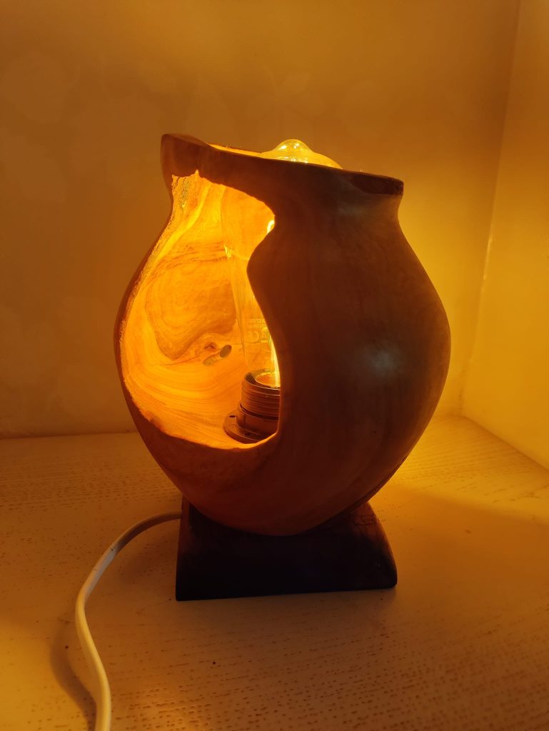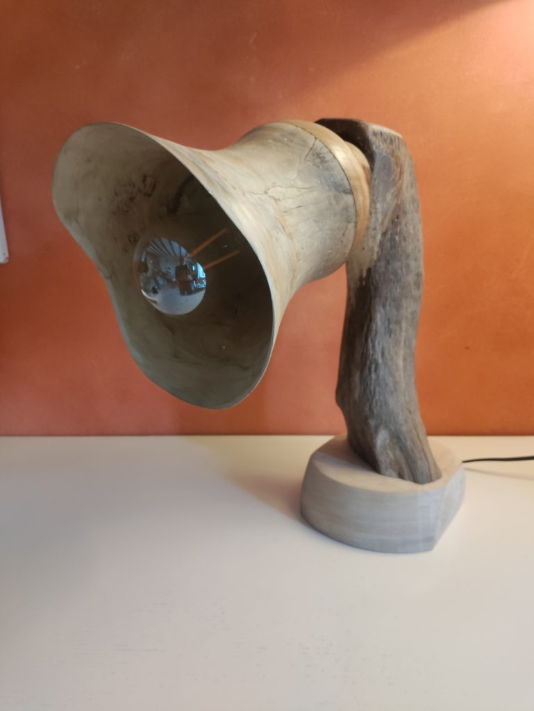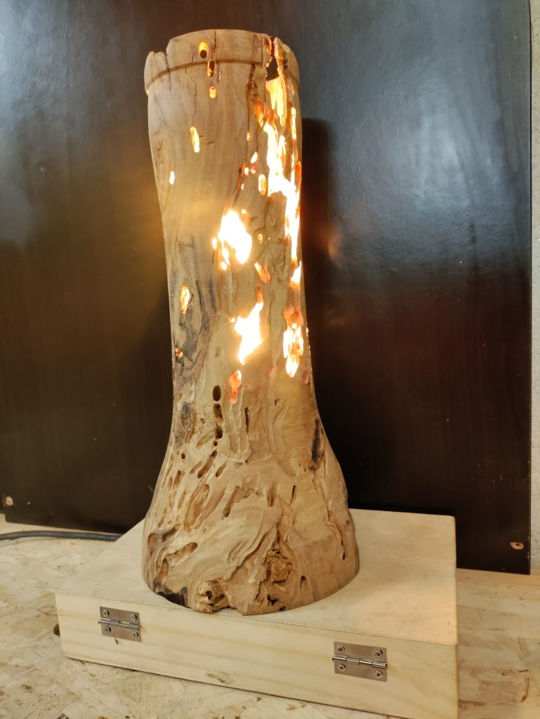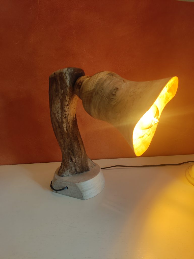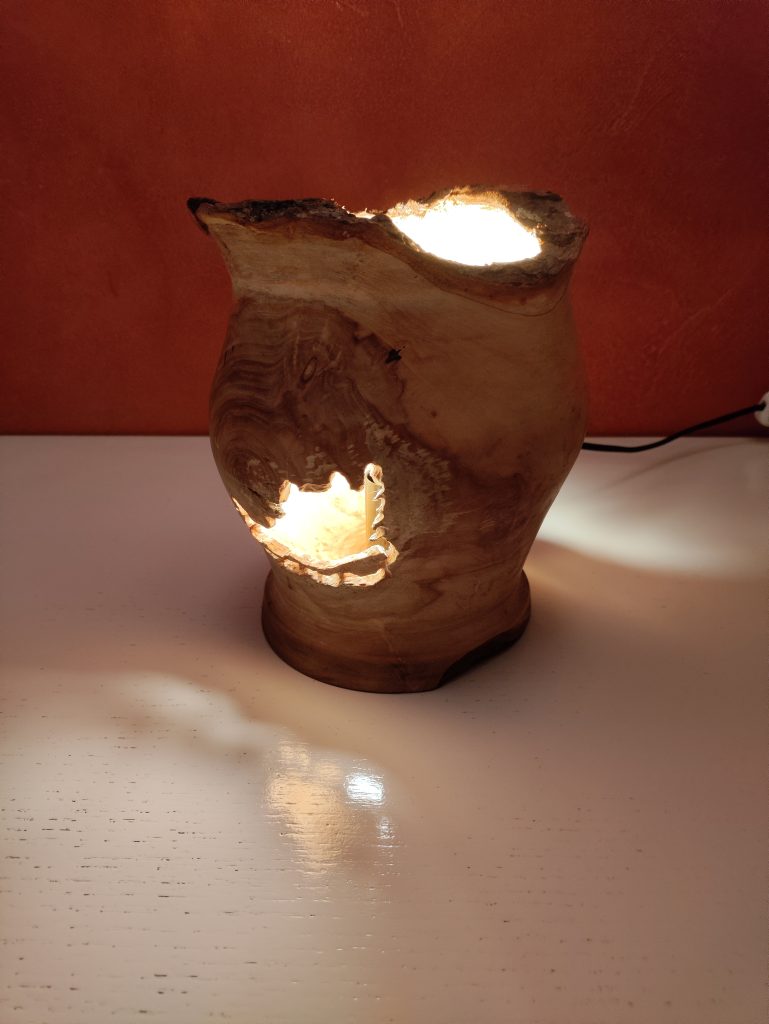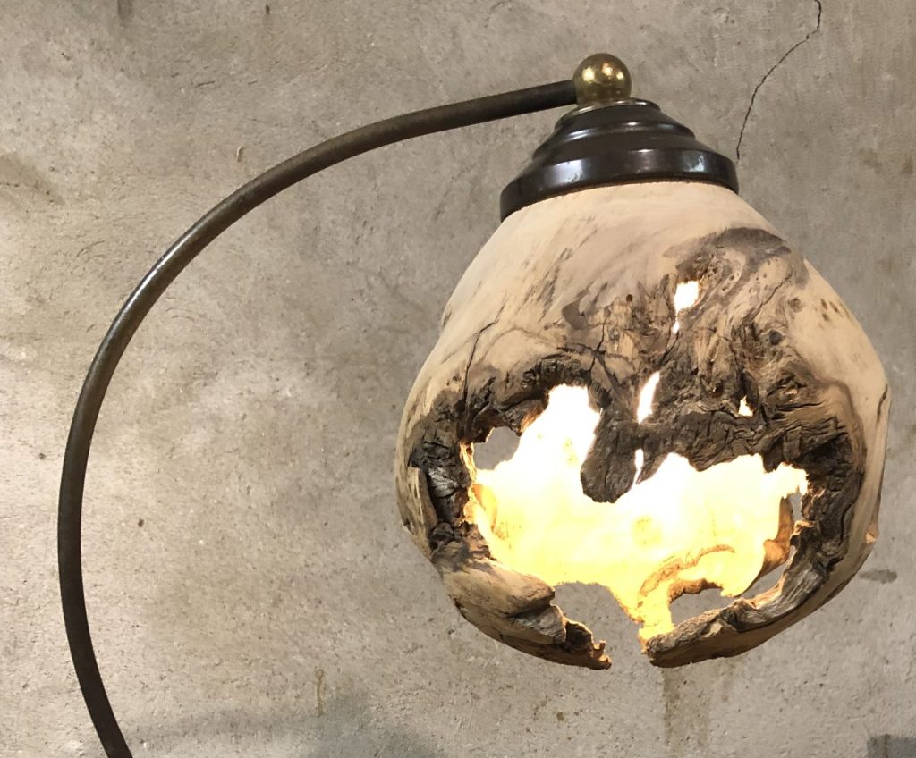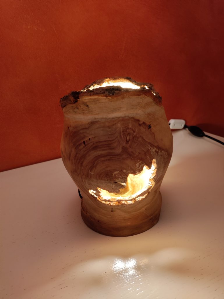 Jeux d’ombres et lumières, souvent sublimées par les blessures de la pièce de bois …On trouvera ici de la lumière, diffusée pat des lampes de chevet, des abats jours, parfois en translucidité à travers une fine couche de bois…