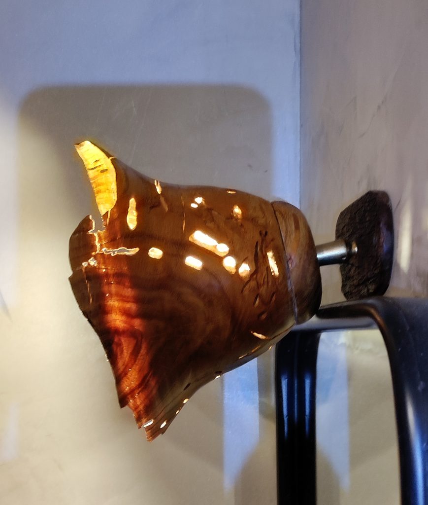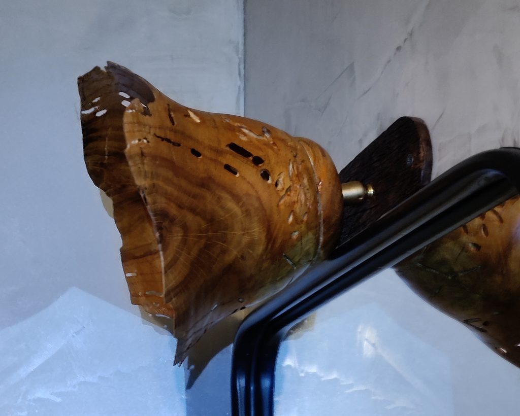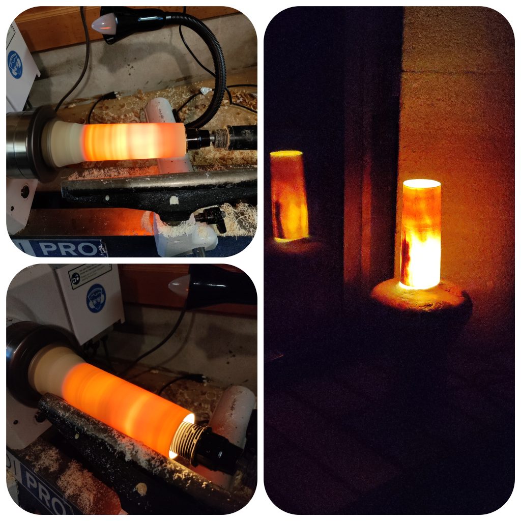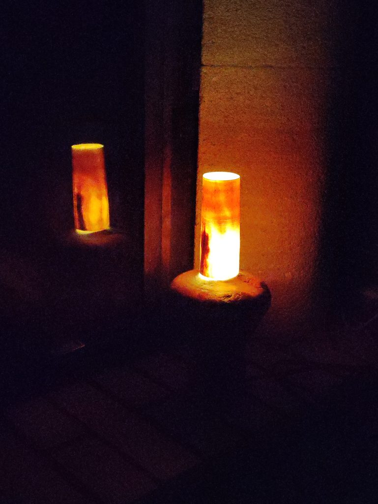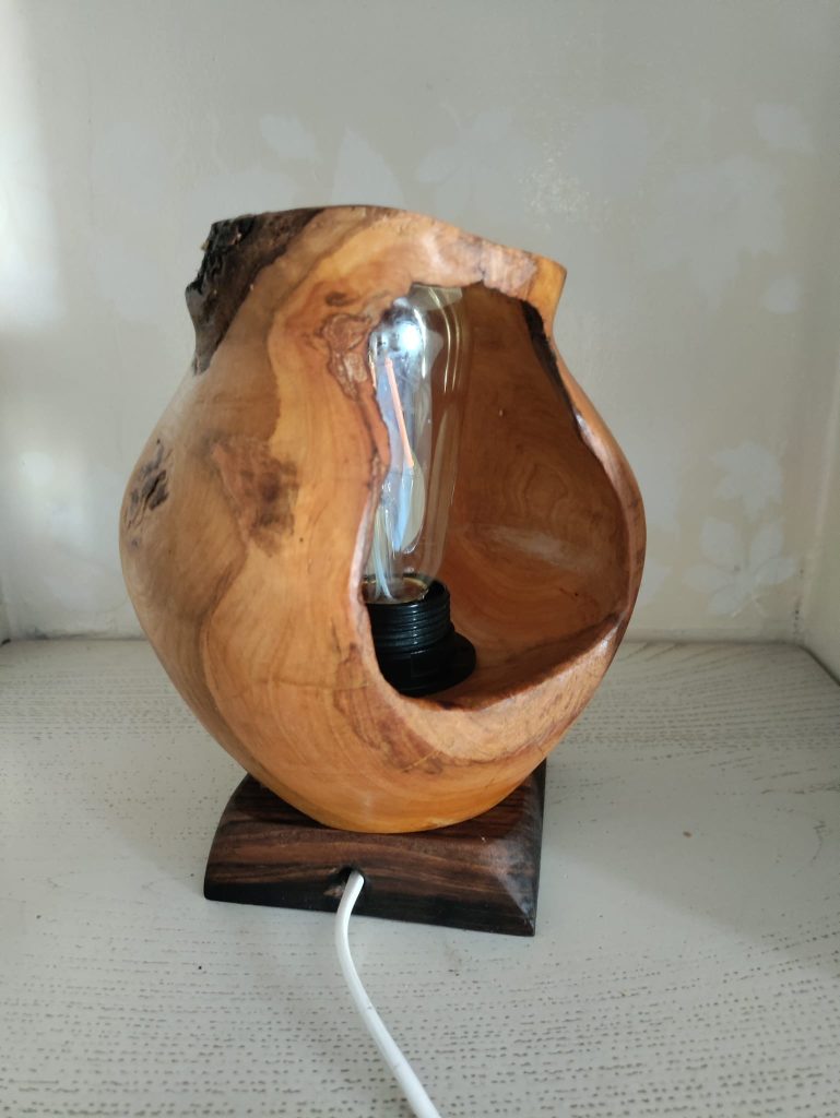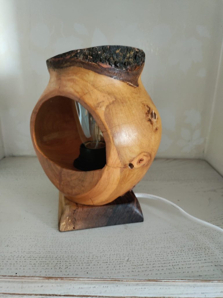 Jeux d’ombres et lumières, souvent sublimées par les blessures de la pièce de bois …On trouvera ici de la lumière, diffusée pat des lampes de chevet, des abats jours, parfois en translucidité à travers une fine couche de bois…