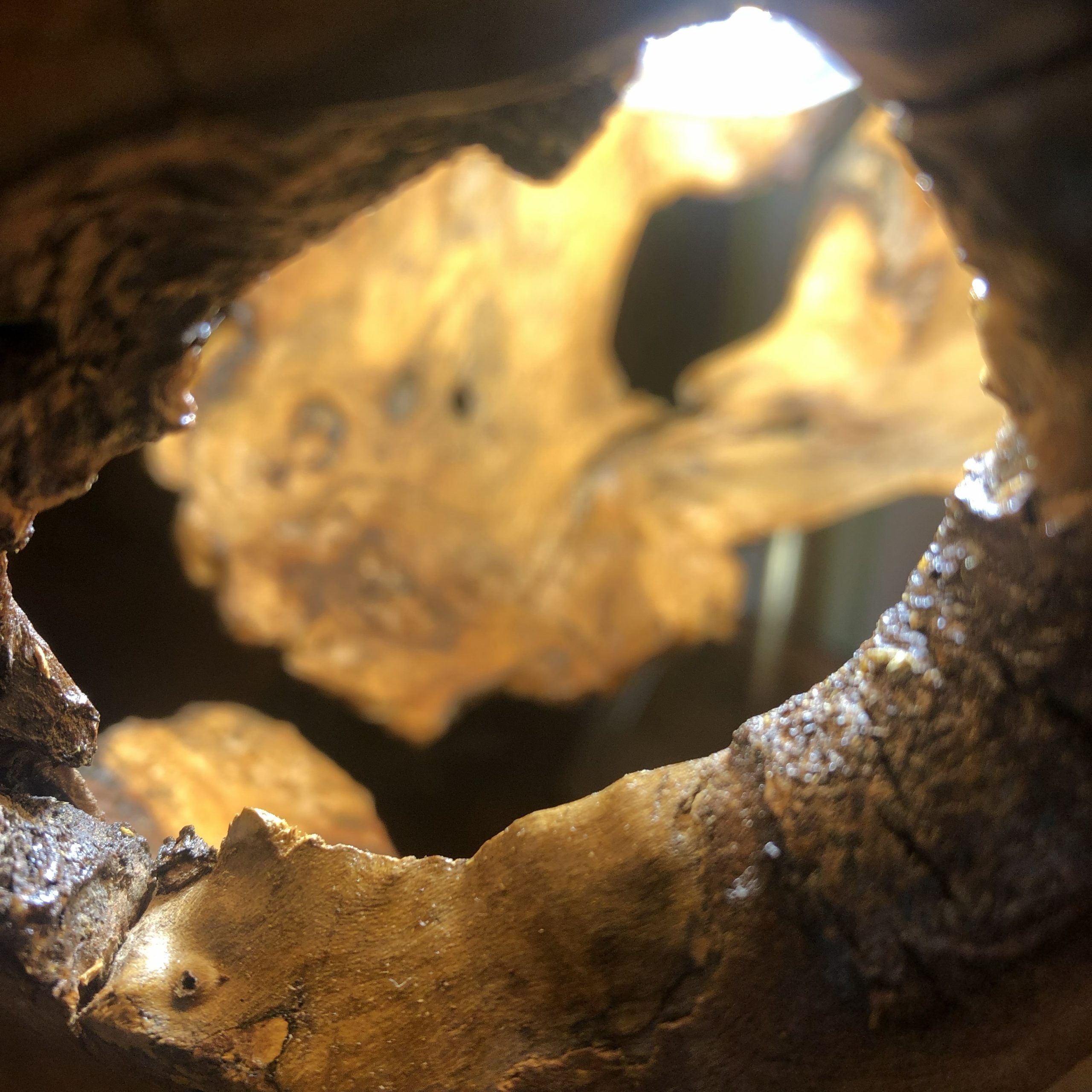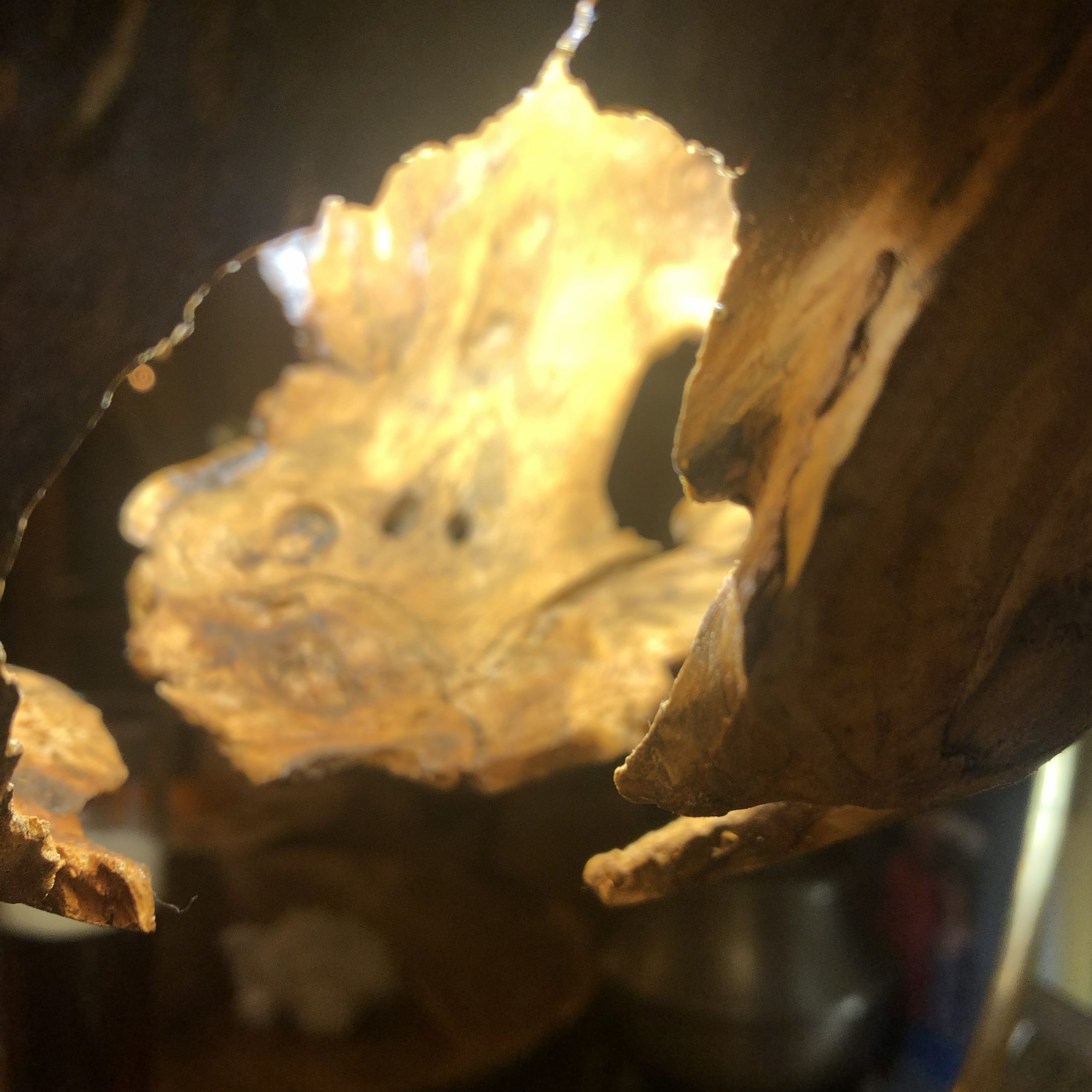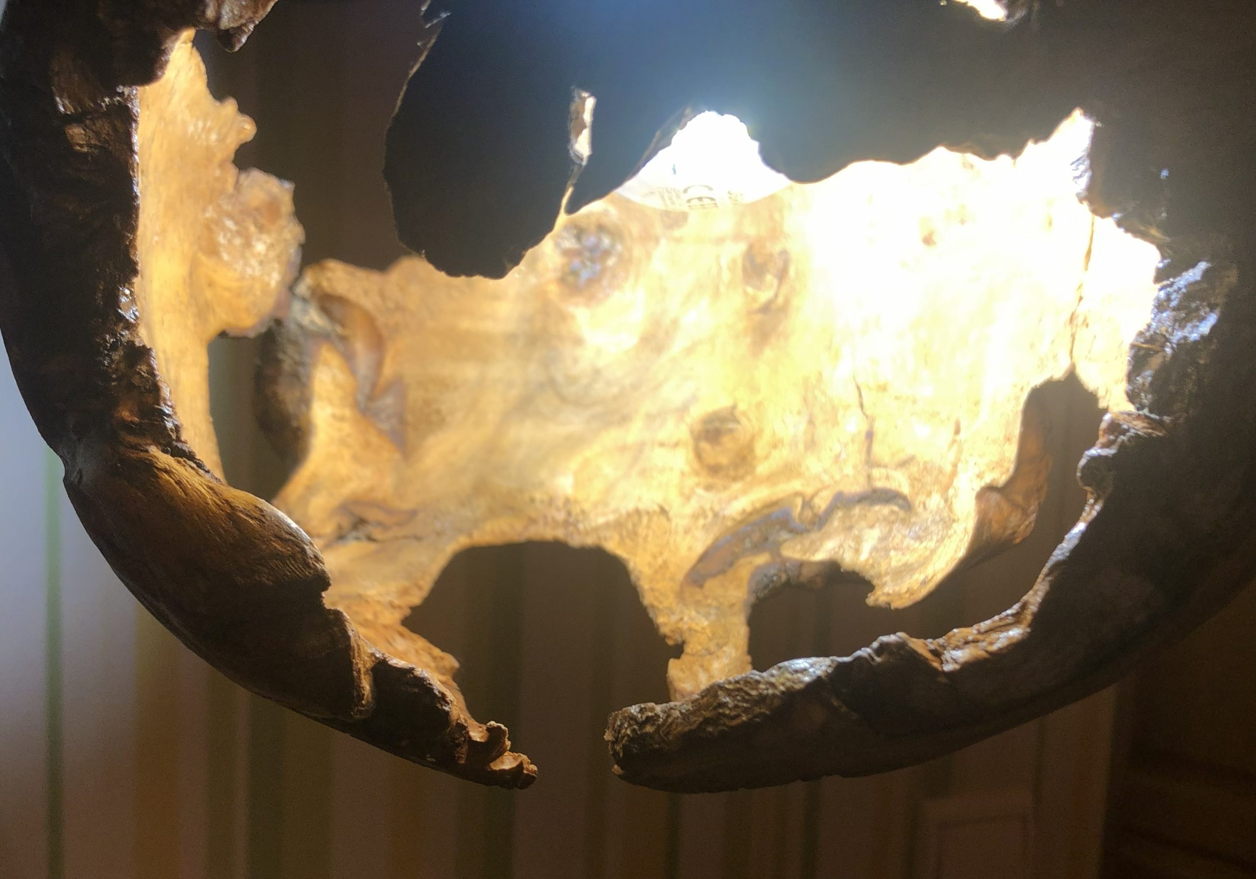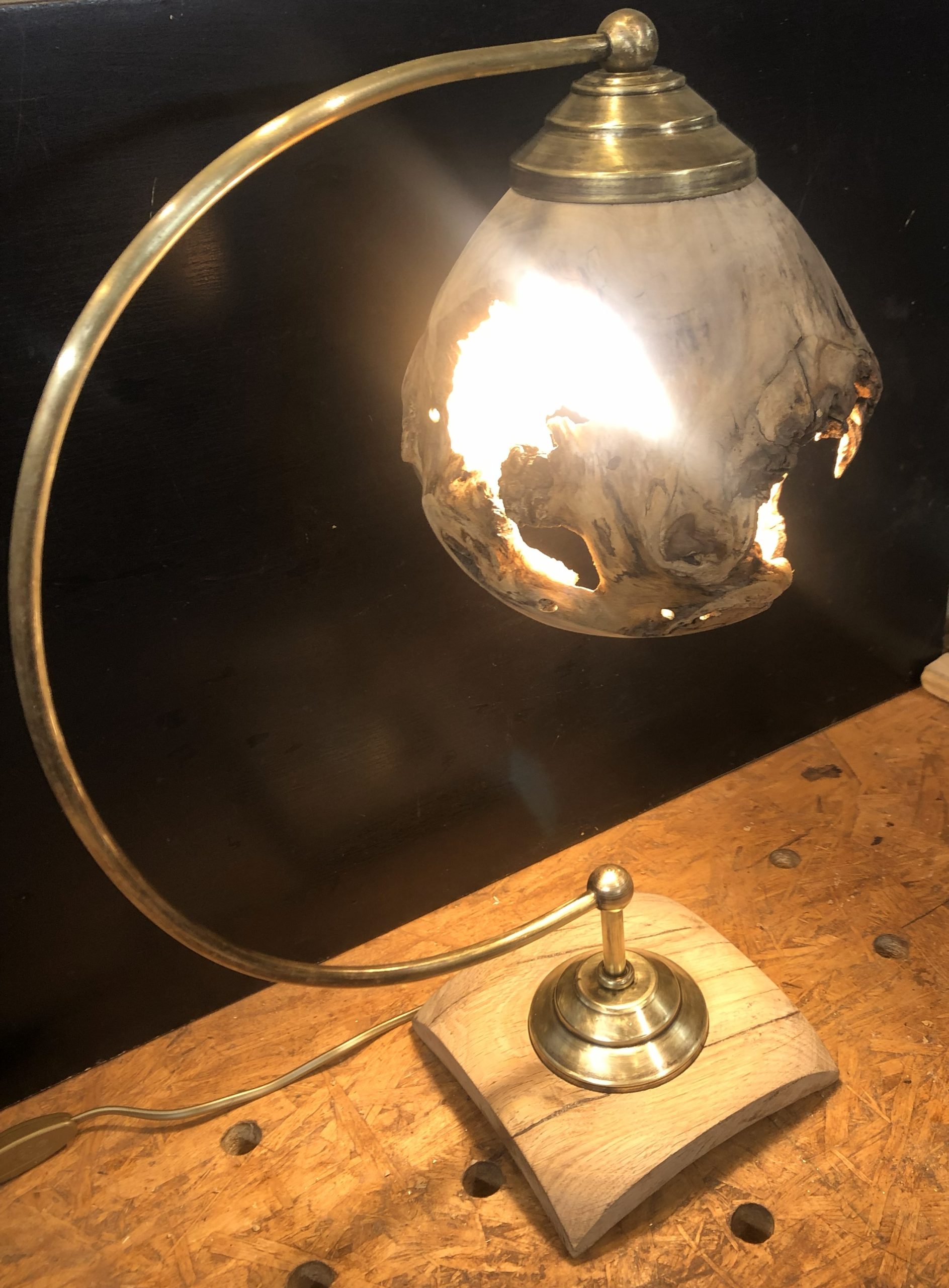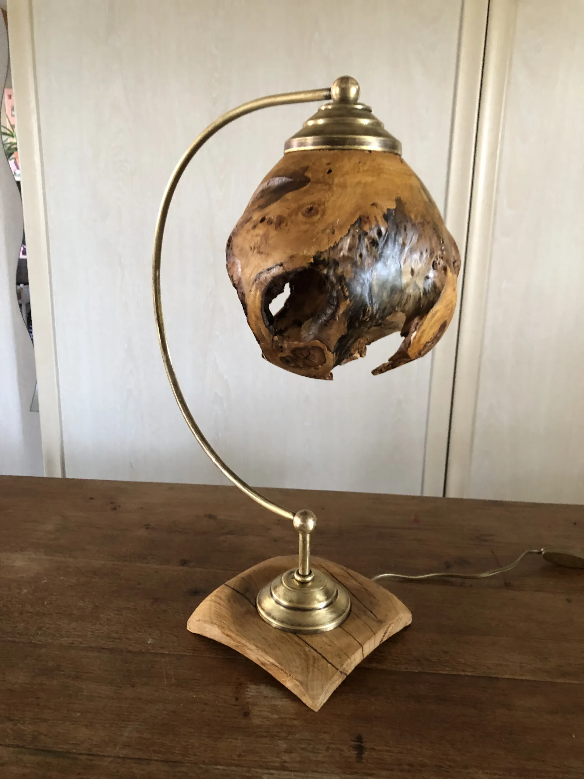 réalisé à partir d’une trogne de tilleul vieux et très échauffé, pied en chêne et armature en laiton (ampoule non fournie douille E27)
