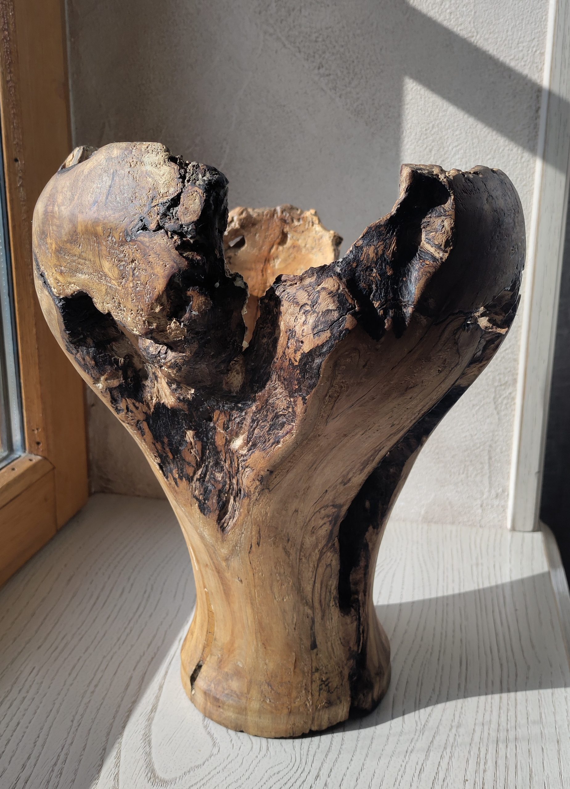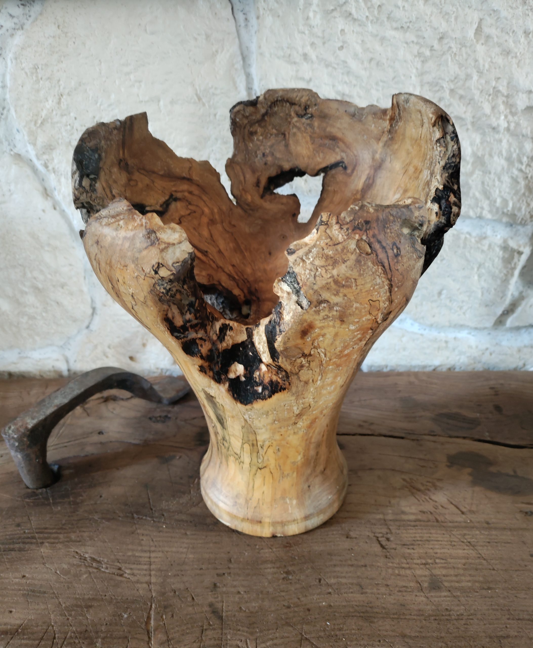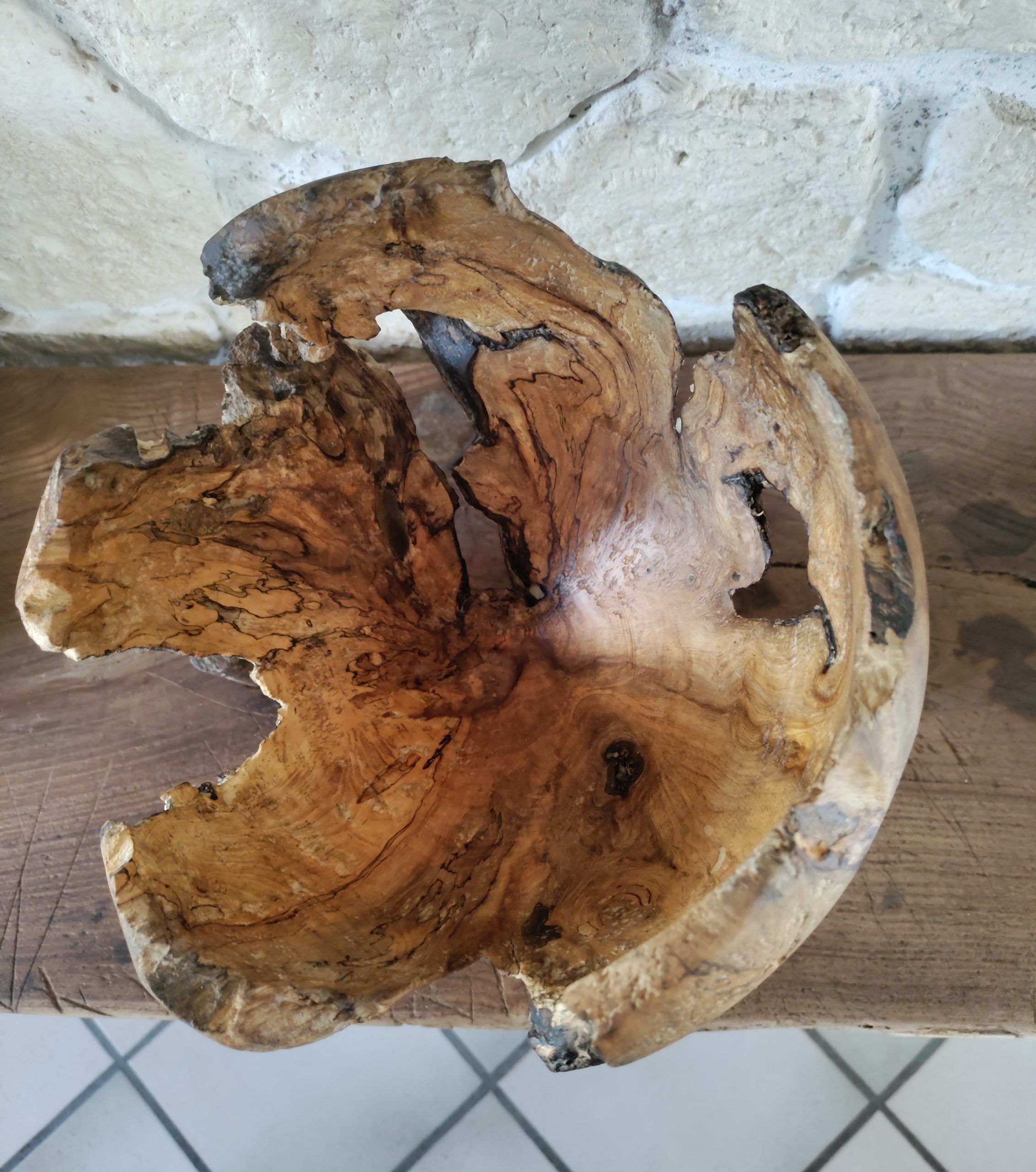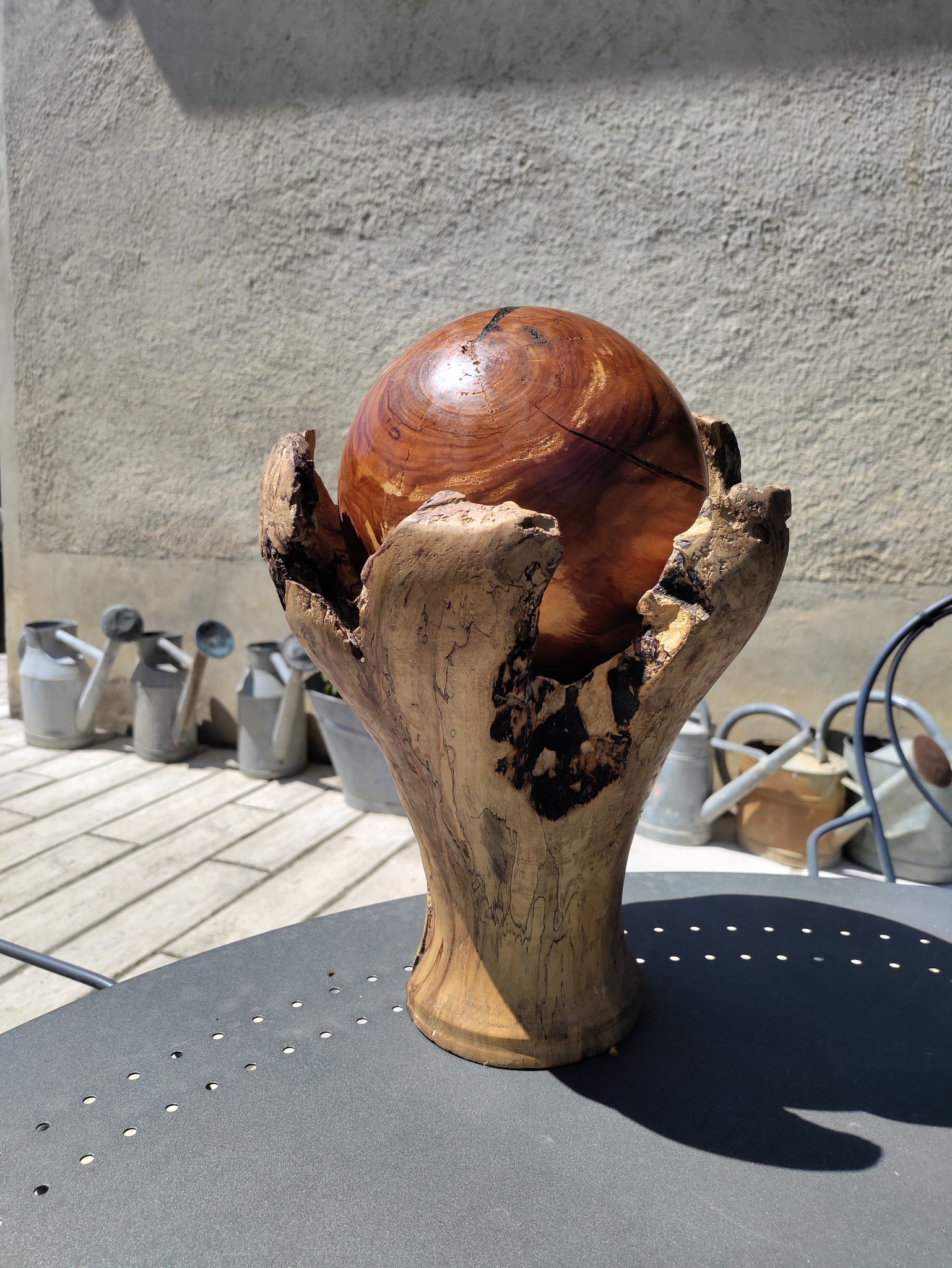 Collection “Monde Fracturé” nø2,Boule en pommier sur support en charme échauffé